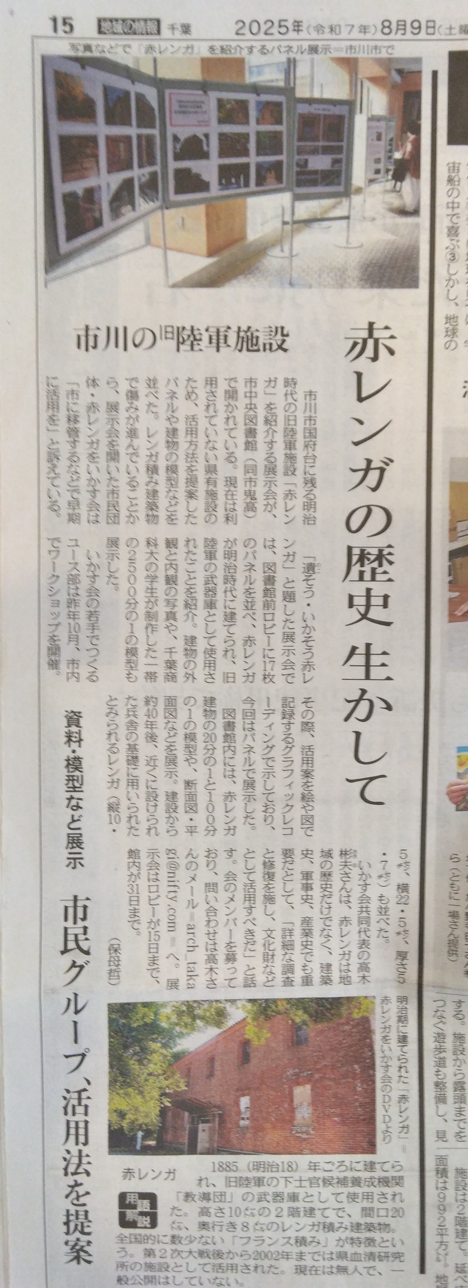 いかす会共同代表の高木彬夫(あきお)さんは、赤レンガは地域の歴史だけでなく、建築史、軍事史、産業史でも重要だとして、「詳細な調査と修復を施し、文化財などとして活用すべきだ」と話す。会のメンバーを募っており、問い合わせは高木さんのメール=arch_takagi@nifty.com=へ。展示会はロビーが15日まで、館内が31日まで。(保母哲)