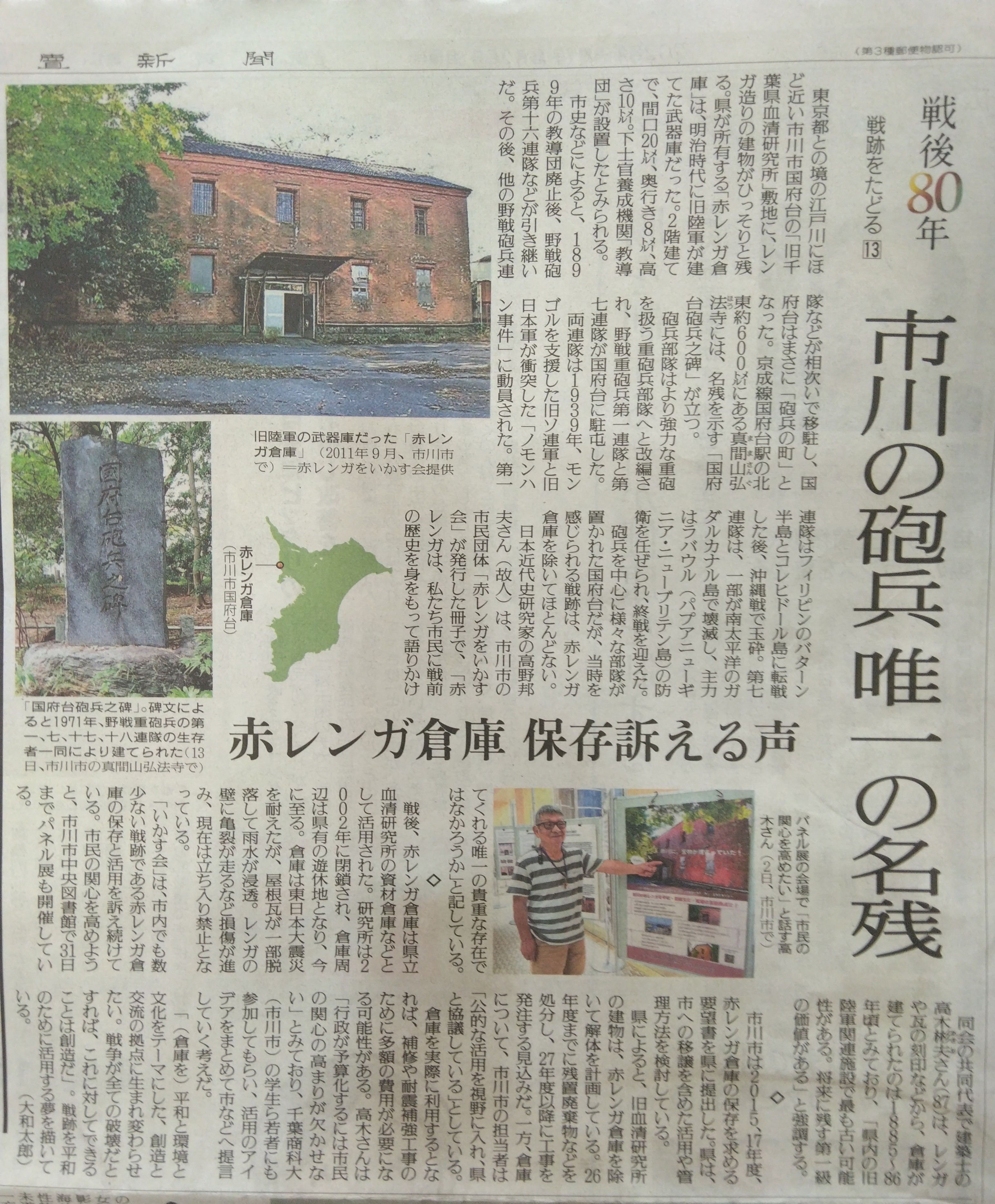 (略)「いかす会」は、市内でも数少ない戦跡である赤レンガ倉庫の保存と活用を訴え続けている。市民の関心を高めようと、市川市中央図書館で31日までパネル展も開催している。
